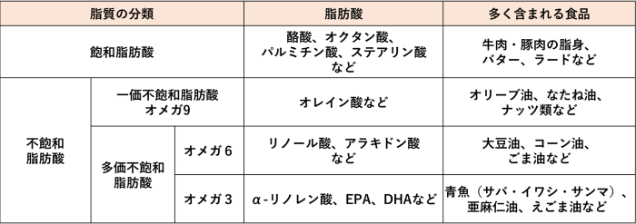 脂質を構成する主な成分は脂肪酸と呼ばれ、飽和脂肪酸と不飽和脂肪酸の2種類に分けられます。さらに不飽和脂肪酸は一価不飽和脂肪酸と多価不飽和脂肪酸に分けられます。