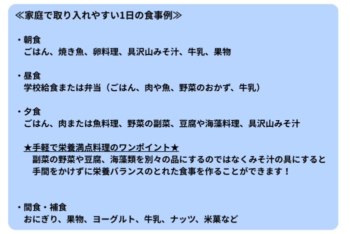 これらは、主食のごはんを中心に、肉・魚・卵・大豆製品などの主菜、野菜や海藻の副菜、牛乳や乳製品、果物などを組み合わせることで、日常の食事でも自然に取り入れることができます。