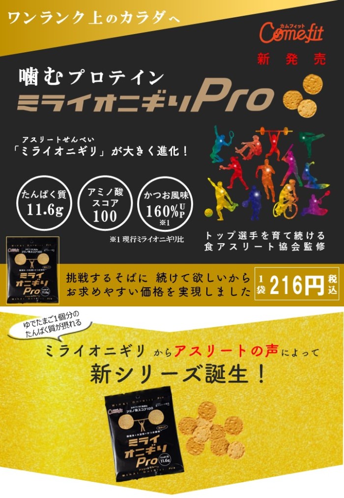 アスリートの食をサポートする一般社団法人食アスリート協会と酒田米菓が共同で開発したお米で作ったプロテインチップスです。