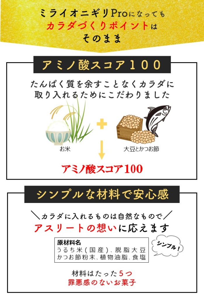 厳選された国産米、鰹節、大豆粉を使用し、タンパク質をもっとも吸収しやすい*アミノ酸スコア100になるよう設計しました。1袋でゆでたまご2個分と同等のたんぱく質量(11.6g)となっており、運動直後のエネルギー補給や、食事で足りない炭水化物とたんぱく質を手軽に摂取できます。